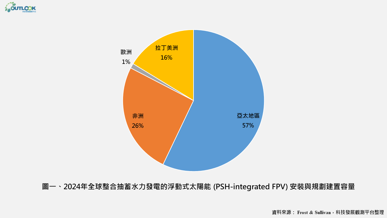 根據Frost & Sullivan在2025年發布的全球太陽能報告指出,浮動式太陽能在亞太地區尤其受到關注,未來FPV的市場成長將更進一步結合多重應用,如與抽蓄水力發電(Pumped Storage Hydropower, PSH)結合,以提升儲能與水資源管理效益,或搭配水產養殖,創造能源與農業共生的價值。亞太地區 (APAC) 整合抽蓄水力發電的浮動式太陽能(PSH-integrated FPV) 安裝與規劃建置容量,在2024年佔全球總量的57.1% (如圖一),台灣、中國、印度及新加坡等國家均有大規模示範案。