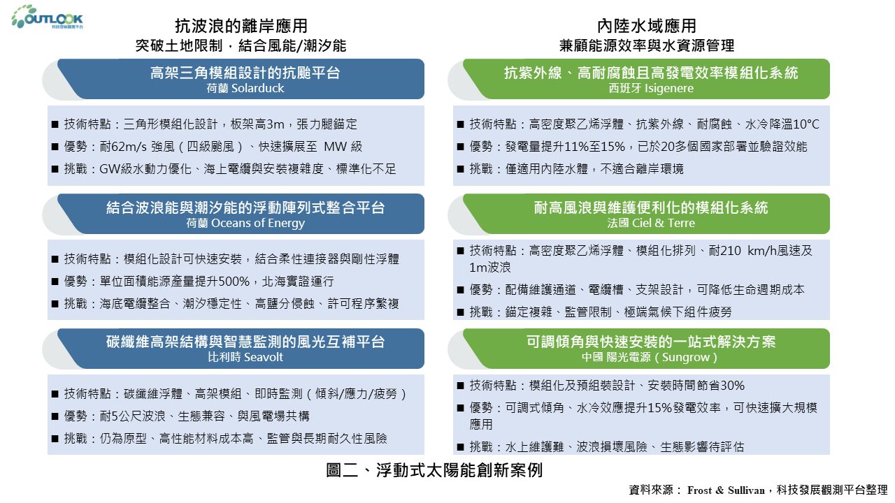 以下摘錄適合亞太地區氣候的浮動式太陽能創新案例,分為離岸與水庫應用,並說明其技術創新特點、優勢及挑戰。