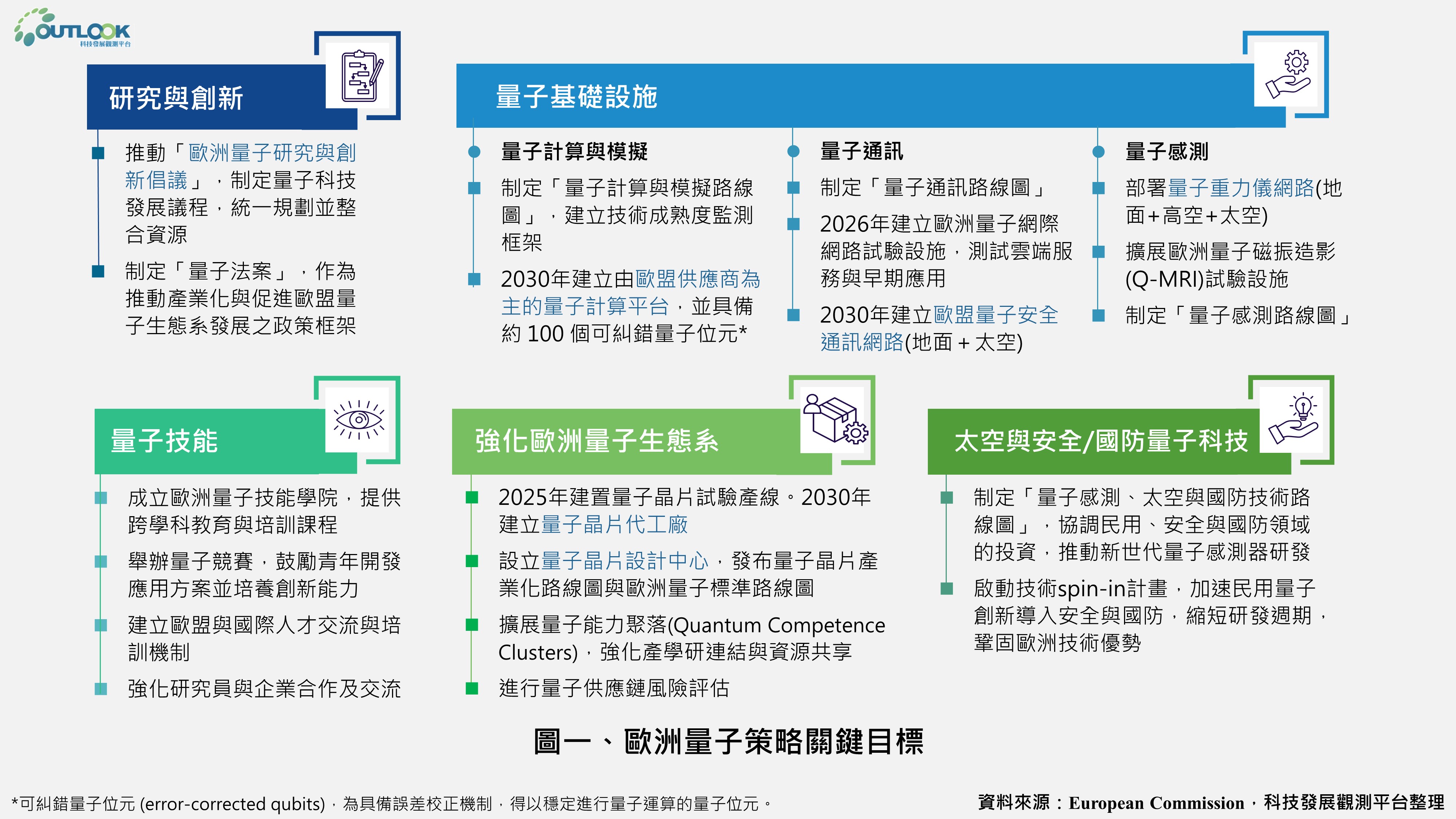 歐盟過去五年已投入龐大經費(超過110億歐元)發展量子科技。然而,目前歐盟量子科技多分散在不同成員國與計畫間,且彼此缺乏協調,導致出現重複投資、資源與人才不足等現象。有鑑於此,歐盟執委會規劃推動「歐洲量子研究與創新倡議(Quantum Europe Research and Innovation Initiative)」制定量子科技發展議程,統一規劃並整合相關資源,建立協調一致的戰略目標,以避免分散投入。此倡議涵蓋下列三個面向: