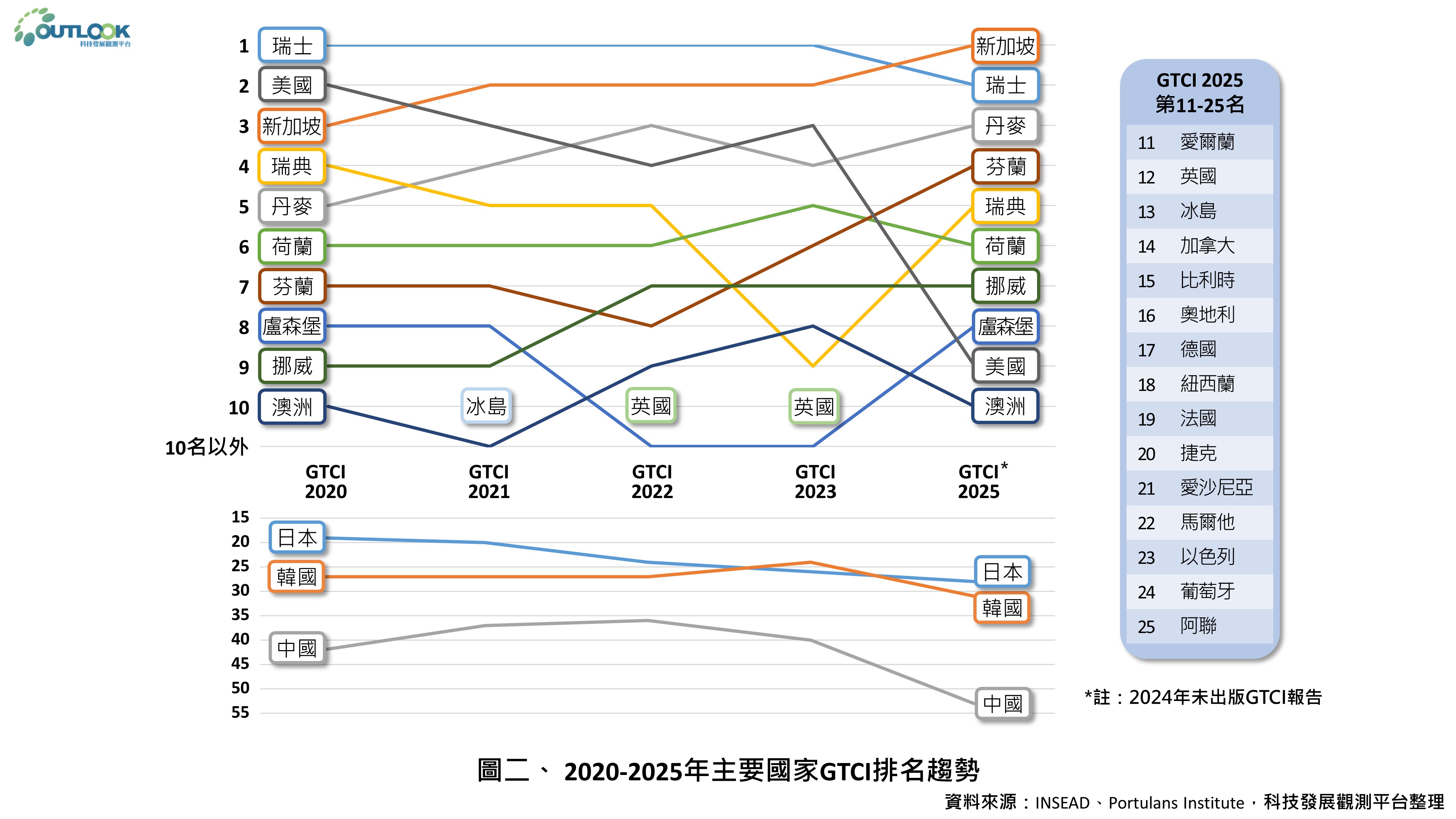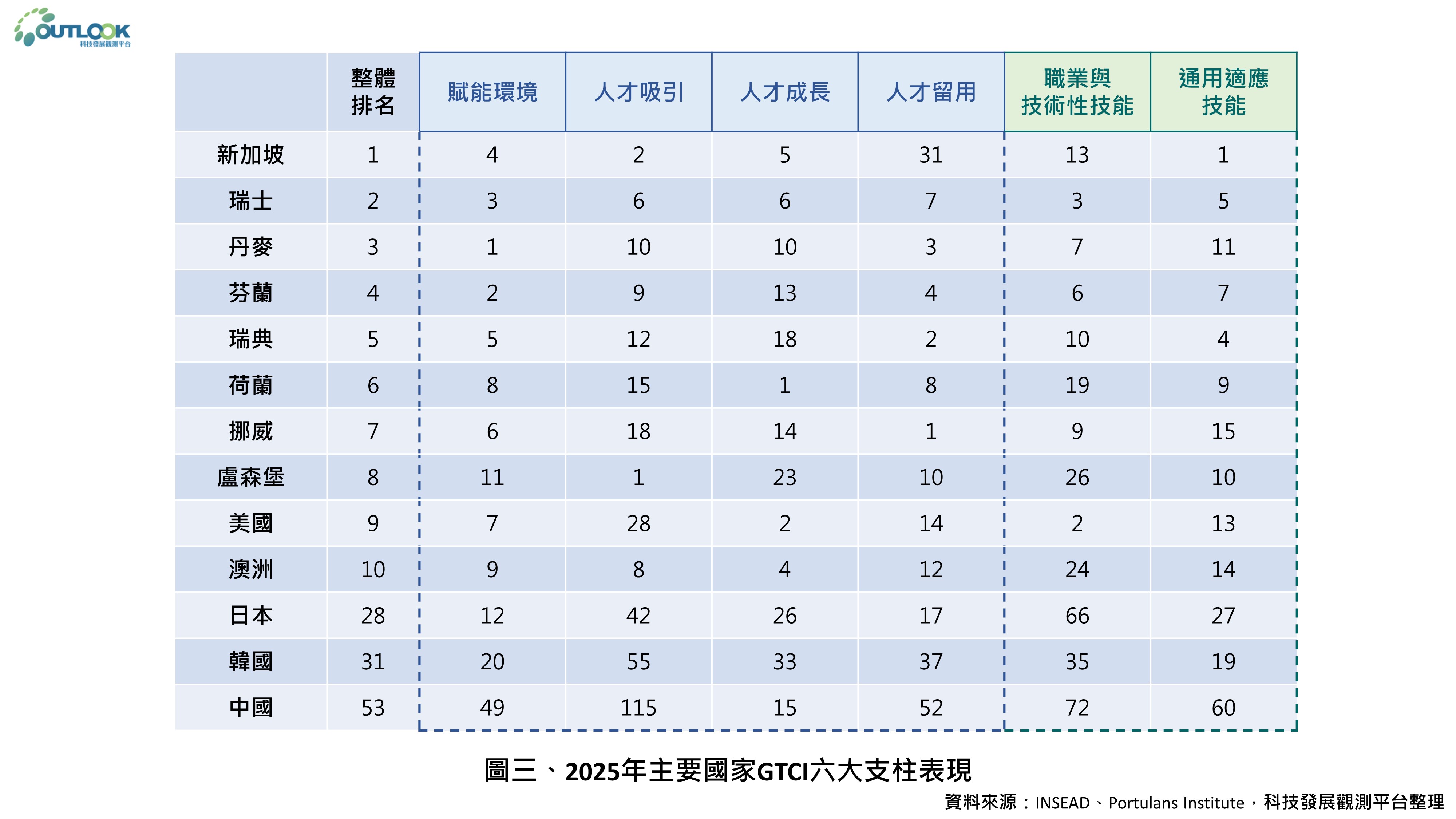 歐洲工商管理學院(INSEAD)與美國研究機構Portulans Institute合作,於11月發布「2025年全球人才競爭力指數」(Global Talent Competitiveness Index 2025, GTCI 2025)報告,針對全球135個經濟體的人才競爭力進行評比分析;台灣未納入評比。
