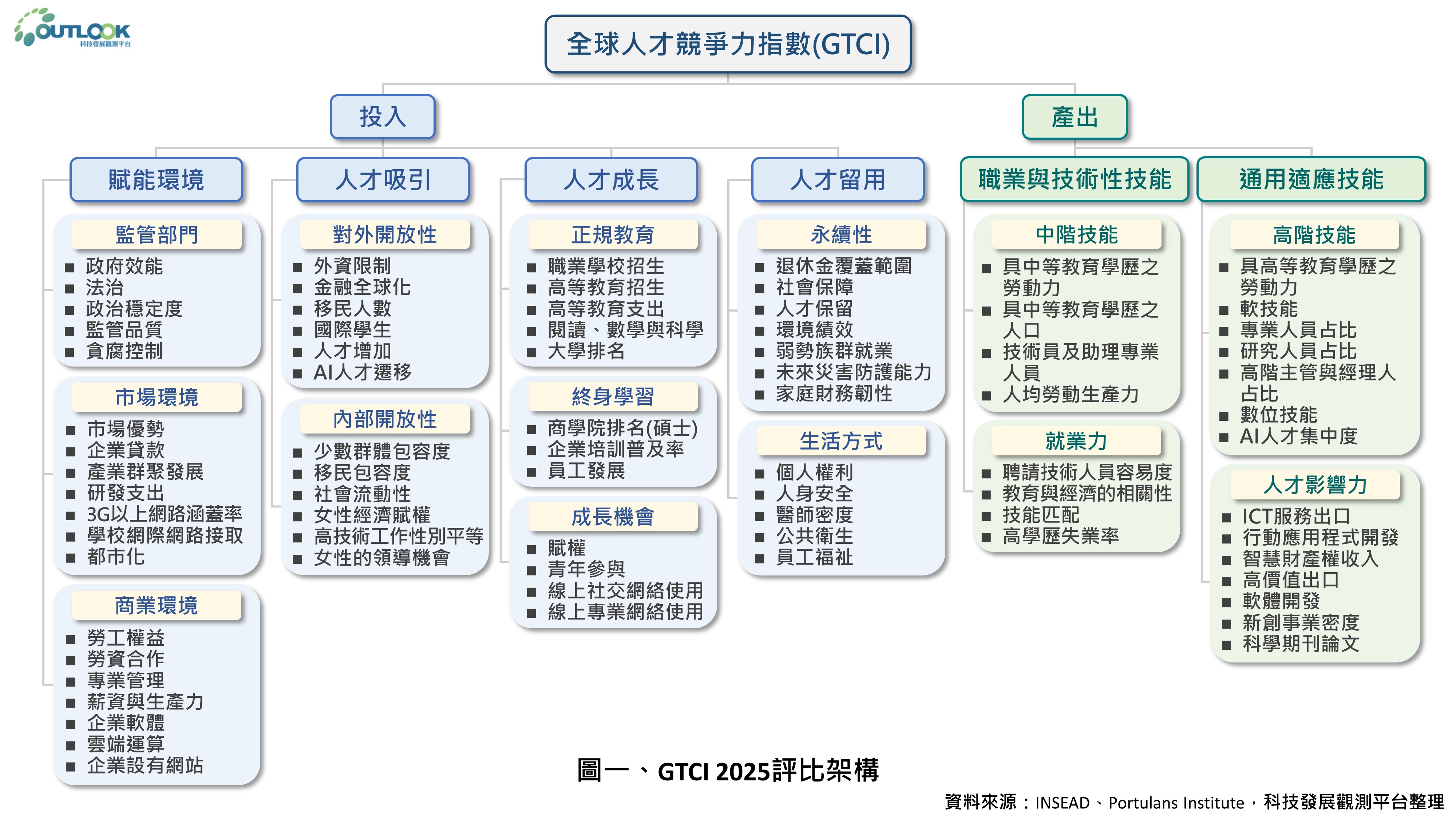 GTCI評比架構分為「投入」與「產出」兩大面向,共設六大支柱。「投入」面向包含四個支柱,分別為:賦能環境、人才吸引、人才成長與人才留用,主要用來衡量影響國家人才生態系統的制度、法規與政策條件;「產出」面向則包含兩個支柱,分別為:職業與技術性技能,以及通用適應技能,反映各國在相關投入下,於技能、生產力與創新方面的成果。六大支柱下再細分為兩至三個子支柱,各子支柱包含四至七個細項指標,細項指標合計77項,詳見圖一。